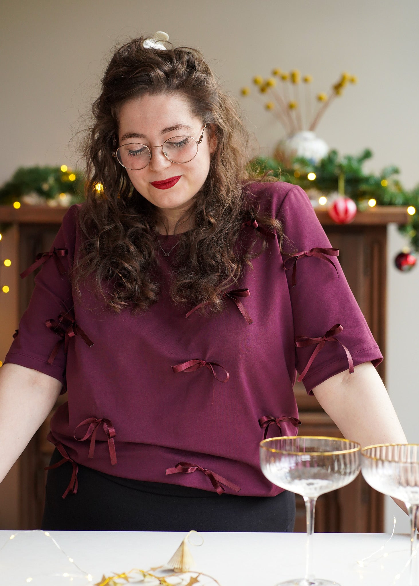 Vorig jaar maakte ze haar debuut in het zwart, deze collectie ook in het bordeaux; top Willemijn! Deze geweldige top van in de basis katoenen French Terry hangt vol met prachtig satijnen strikjes. Ieder strikje is door mij zelf gestrikt en vervolgens zijn stuk voor stuk afgebrand zodat de uiteindes niet gaan rafelen.